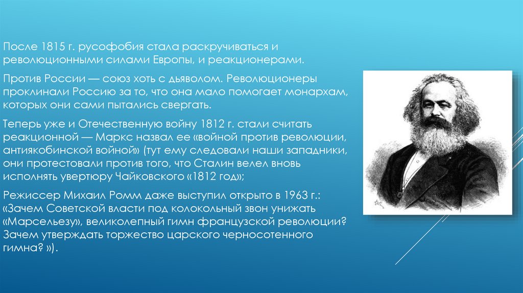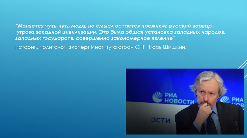 “Меняется чуть-чуть мода, но смысл остается прежним: русский варвар –угроза западной цивилизации. Это была общая установка западных народов,