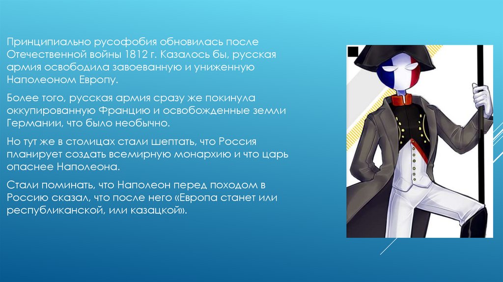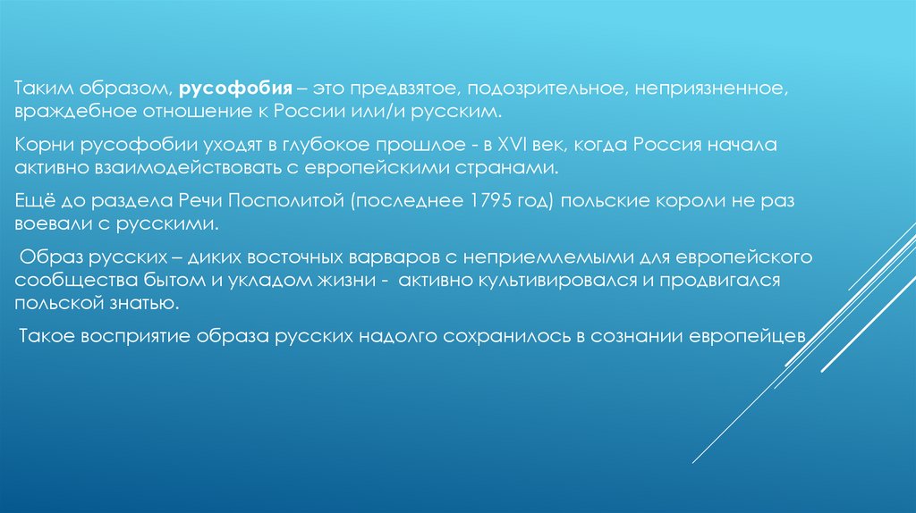 Таким образом, русофобия – это предвзятое, подозрительное, неприязненное,враждебное отношение к России или/и русским.