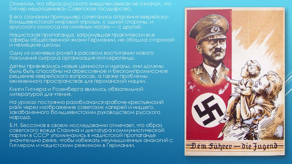 Отметим, что образ русского «недочеловека» не означал, чтоГитлер недооценивал Советское государство.