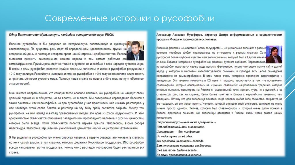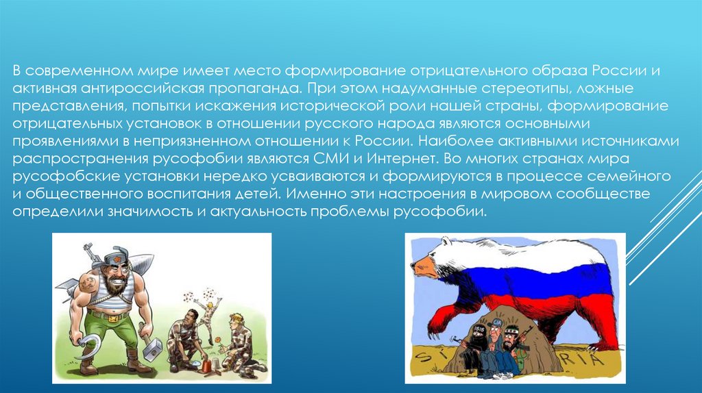 В современном мире имеет место формирование отрицательного образа России иактивная антироссийская пропаганда. При этом надуманные стереотипы, ложные