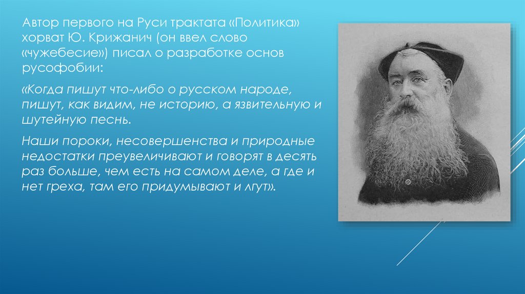 Автор первого на Руси трактата «Политика»хорват Ю. Крижанич (он ввел слово