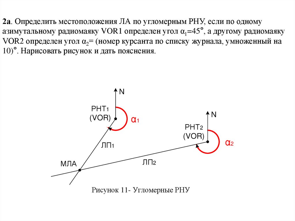 2а. Определить местоположения ЛА по угломерным РНУ, если по одномуазимутальному радиомаяку VOR1 определен угол α1=45°, а другому радиомаяку