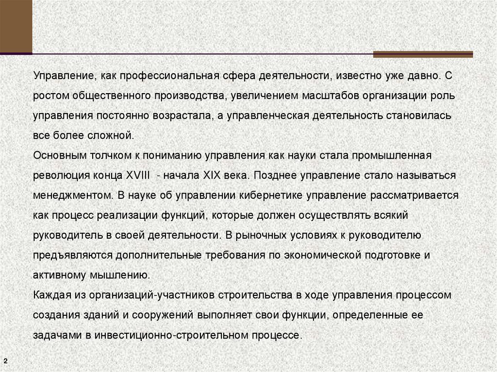 Управление, как профессиональная сфера деятельности, известно уже давно. Сростом общественного производства, увеличением масштабов организации роль