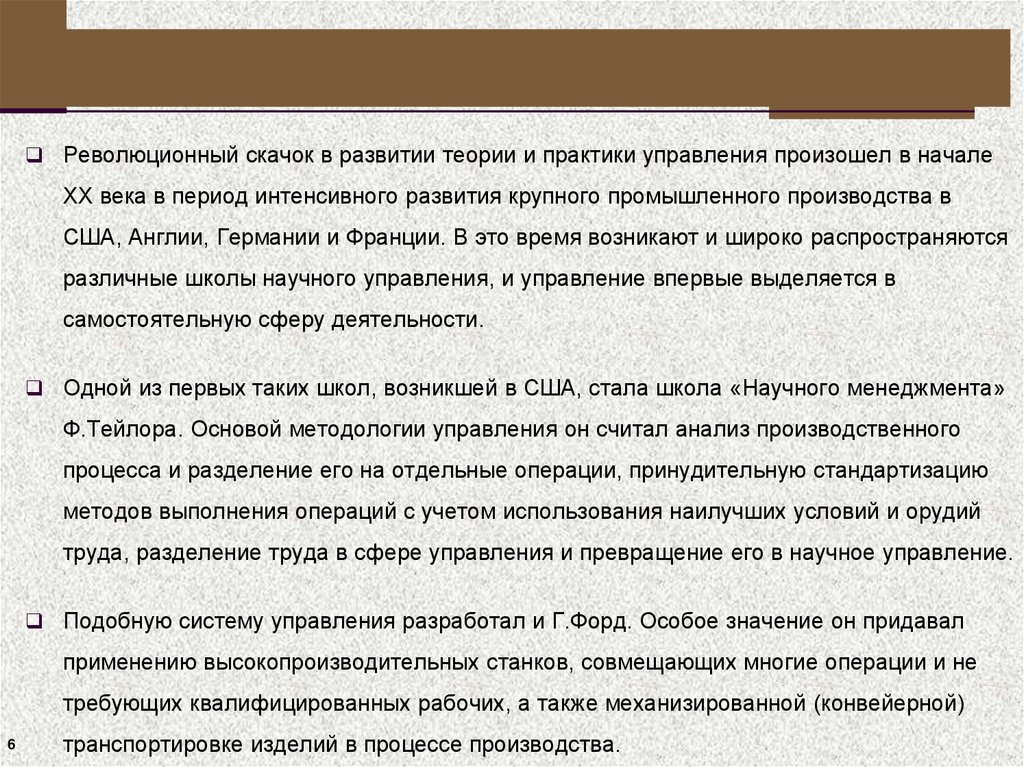 Революционный скачок в развитии теории и практики управления произошел в началеXX века в период интенсивного развития крупного промышленного производства в