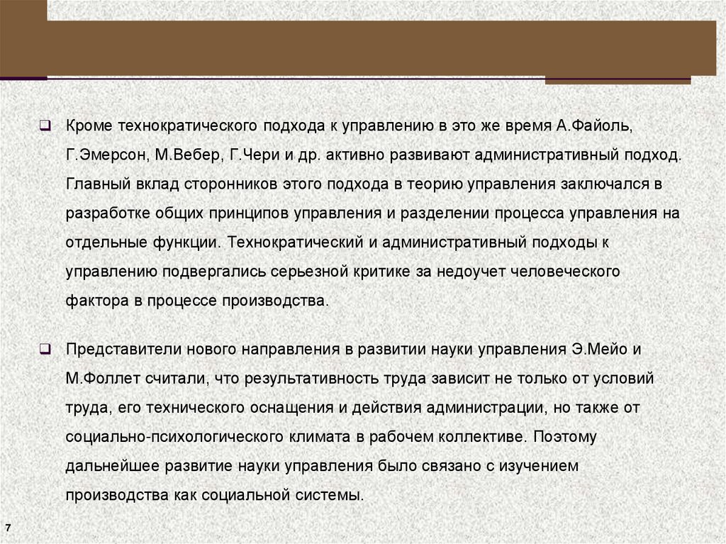 Кроме технократического подхода к управлению в это же время А.Файоль,Г.Эмерсон, М.Вебер, Г.Чери и др. активно развивают административный подход.