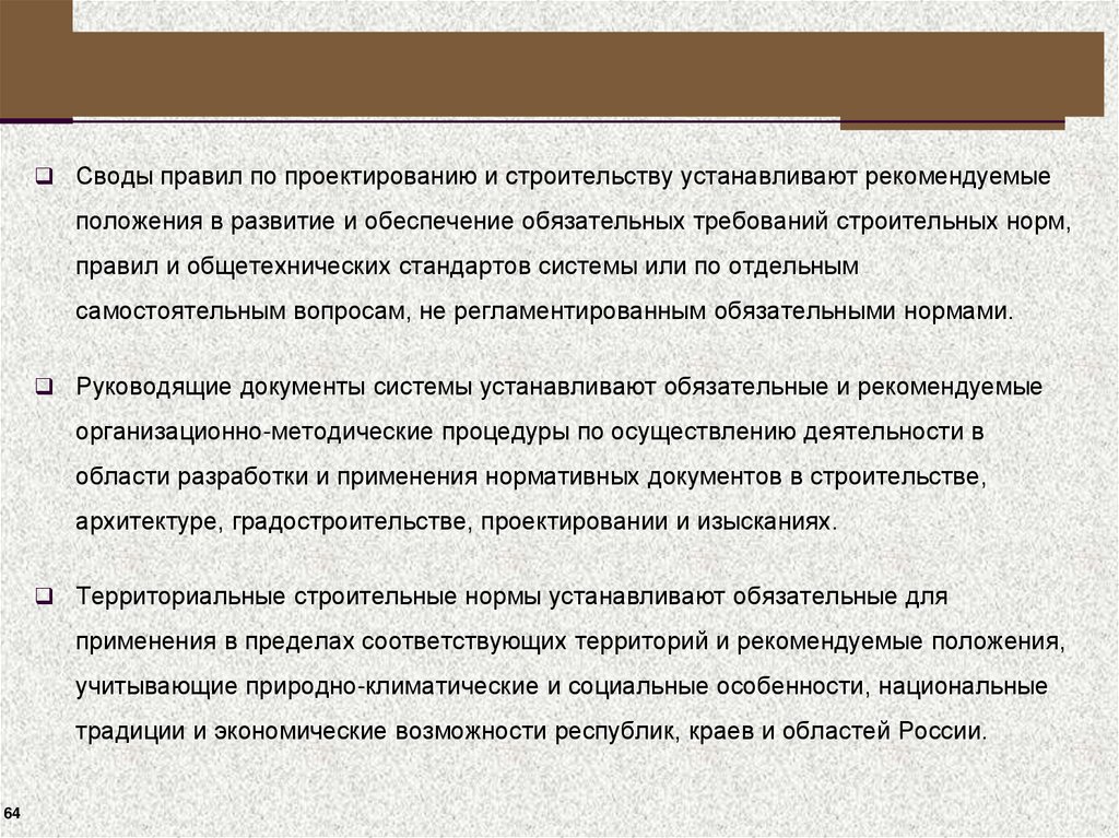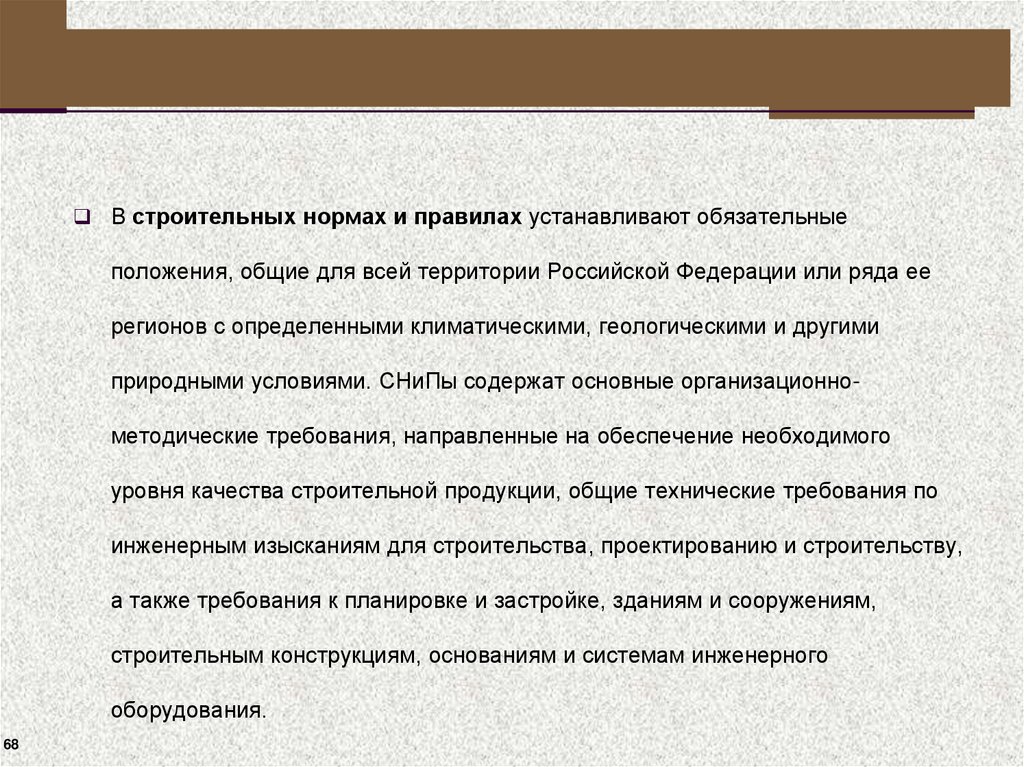В строительных нормах и правилах устанавливают обязательныеположения, общие для всей территории Российской Федерации или ряда ее
