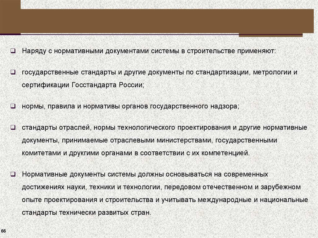 Наряду с нормативными документами системы в строительстве применяют:государственные стандарты и другие документы по стандартизации, метрологии и
