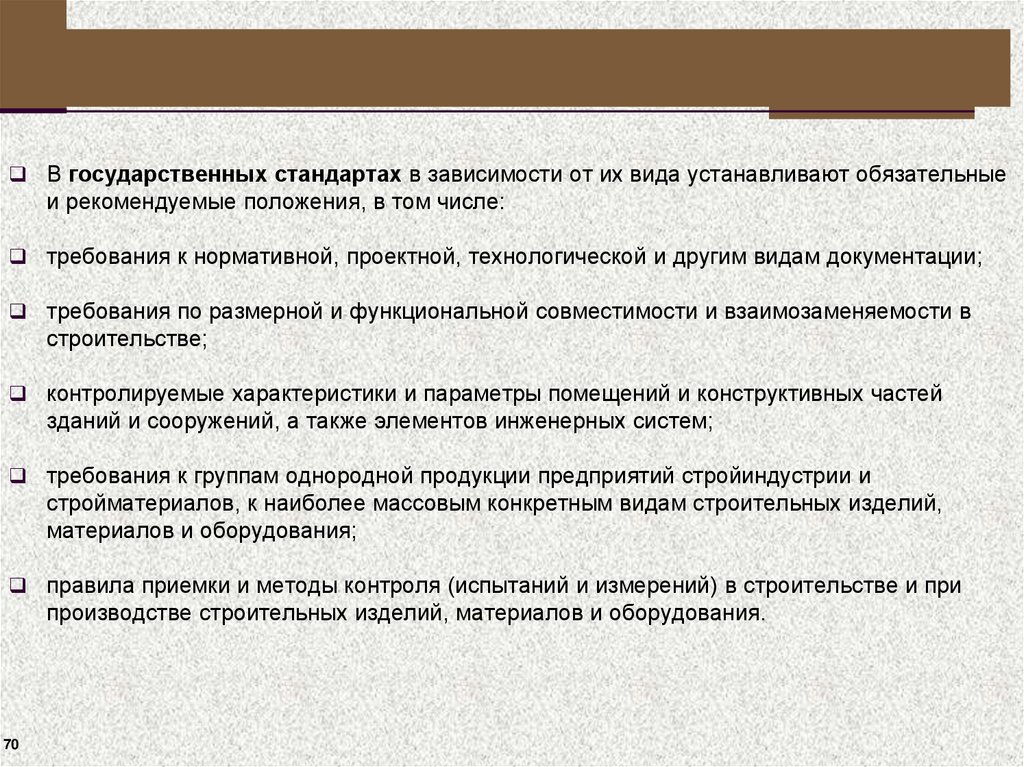 В государственных стандартах в зависимости от их вида устанавливают обязательныеи рекомендуемые положения, в том числе:
