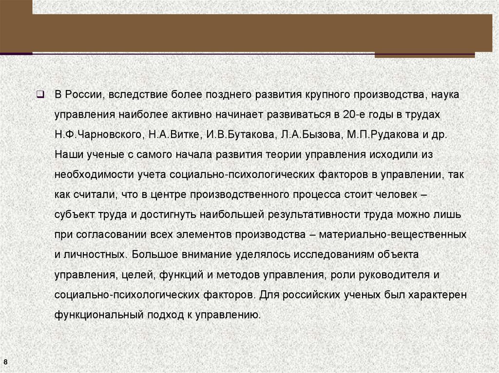 В России, вследствие более позднего развития крупного производства, наукауправления наиболее активно начинает развиваться в 20-е годы в трудах