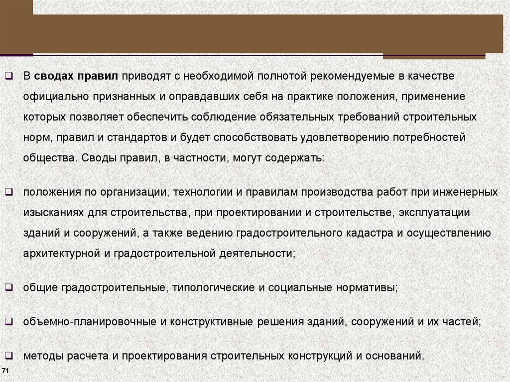 В сводах правил приводят с необходимой полнотой рекомендуемые в качествеофициально признанных и оправдавших себя на практике положения, применение
