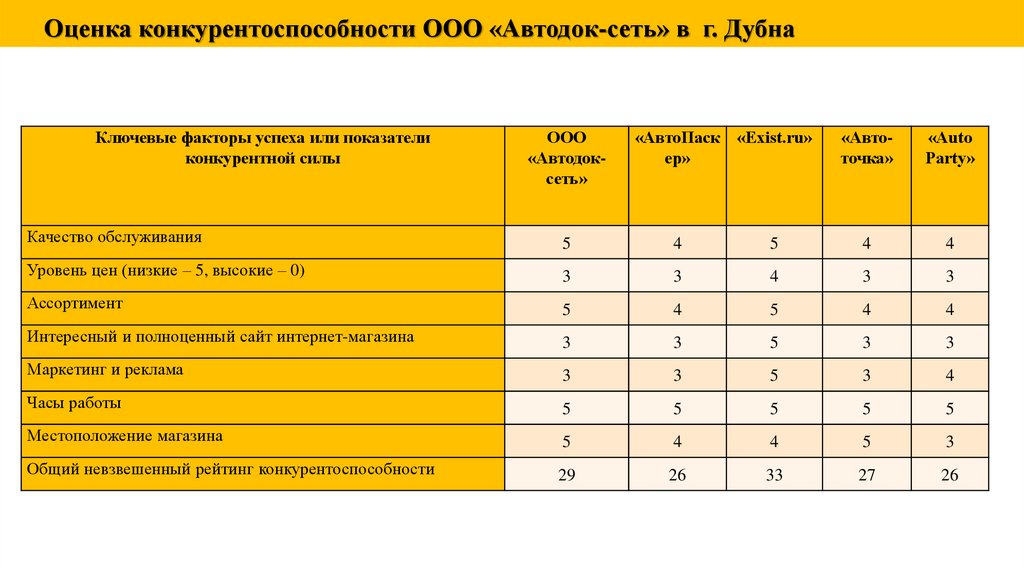 Оценка конкурентоспособности ООО «Автодок-сеть» в г. ДубнаКлючевые факторы успеха или показатели
