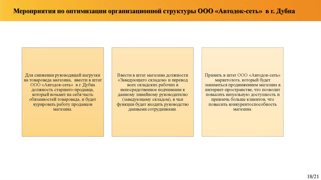 Мероприятия по оптимизации организационной структуры ООО «Автодок-сеть» в г. ДубнаДля снижения руководящей нагрузки