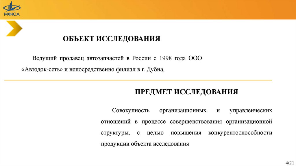 ОБЪЕКТ ИССЛЕДОВАНИЯВедущий продавец автозапчастей в России с 1998 года ООО