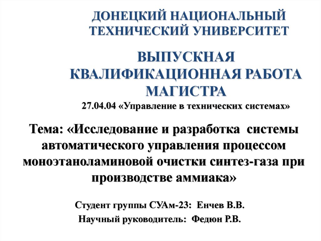 1. Тема: «Исследование и разработка системы автоматического управления процессом моноэтаноламиновой очистки синтез-газа при