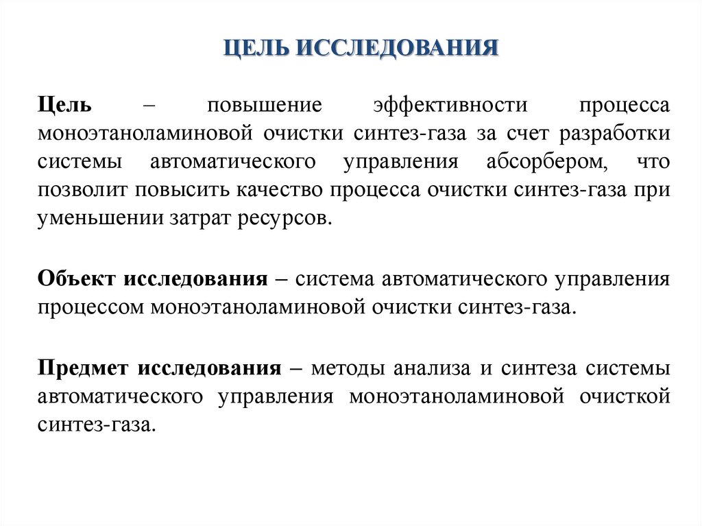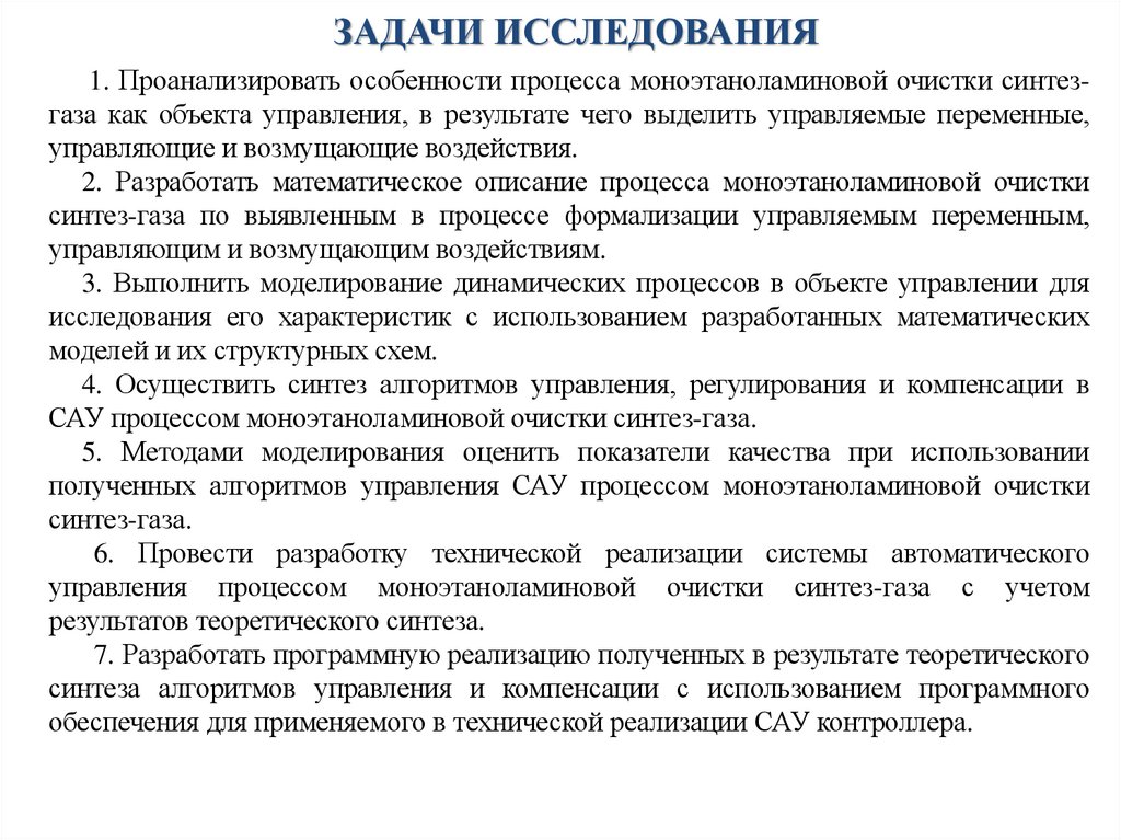 ЗАДАЧИ ИССЛЕДОВАНИЯ1. Проанализировать особенности процесса моноэтаноламиновой очистки синтезгаза как объекта управления, в результате чего выделить управляемые переменные,