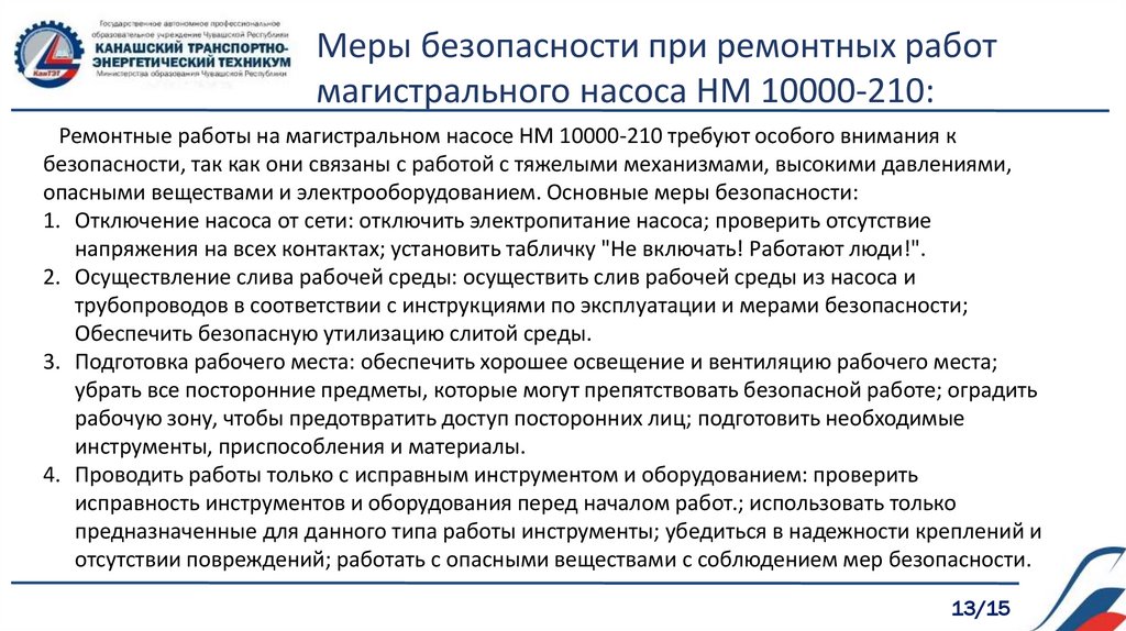 Меры безопасности при ремонтных работмагистрального насоса НМ 10000-210: