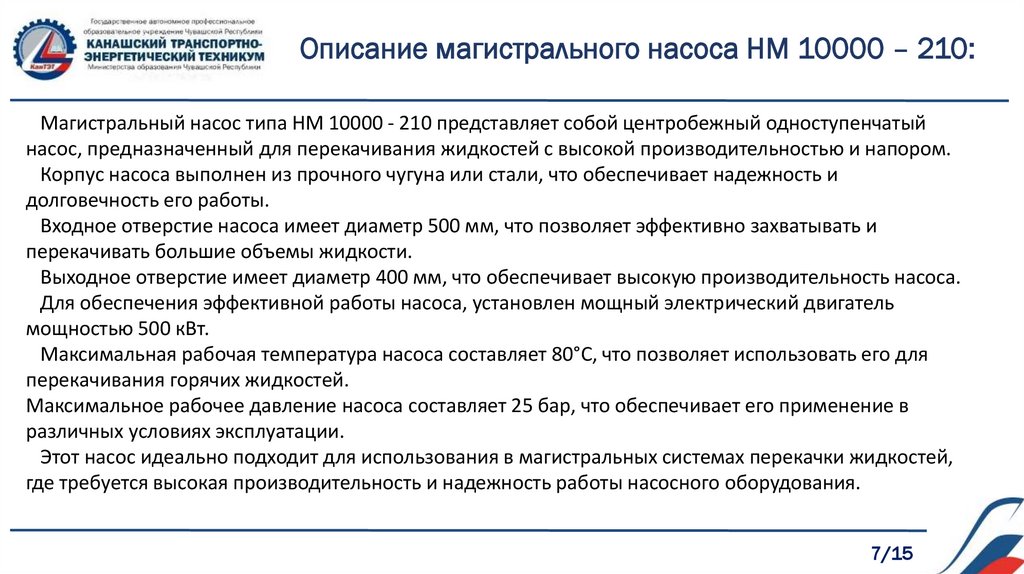 Основные задачи:1. общая характеристика магистрального насоса