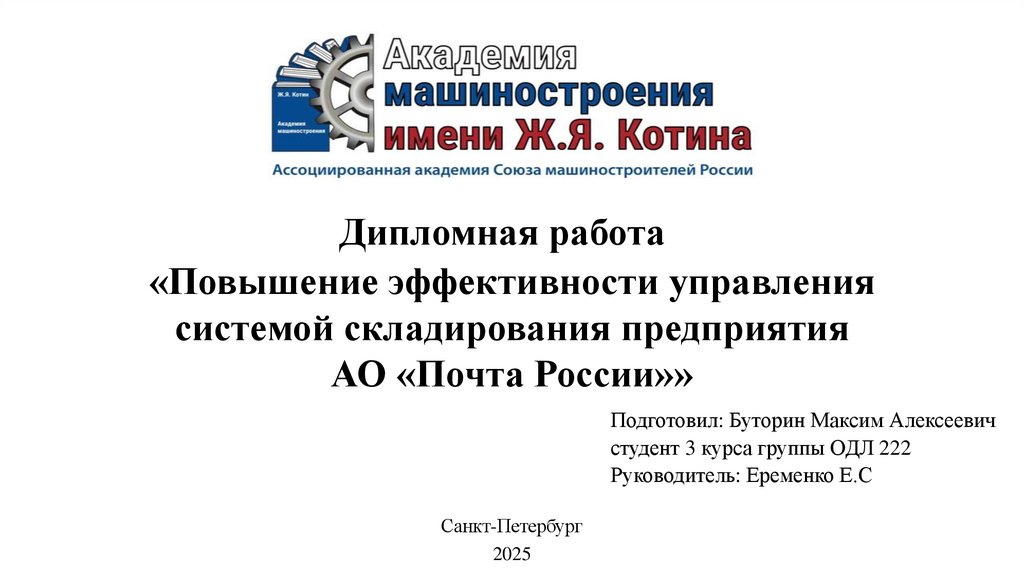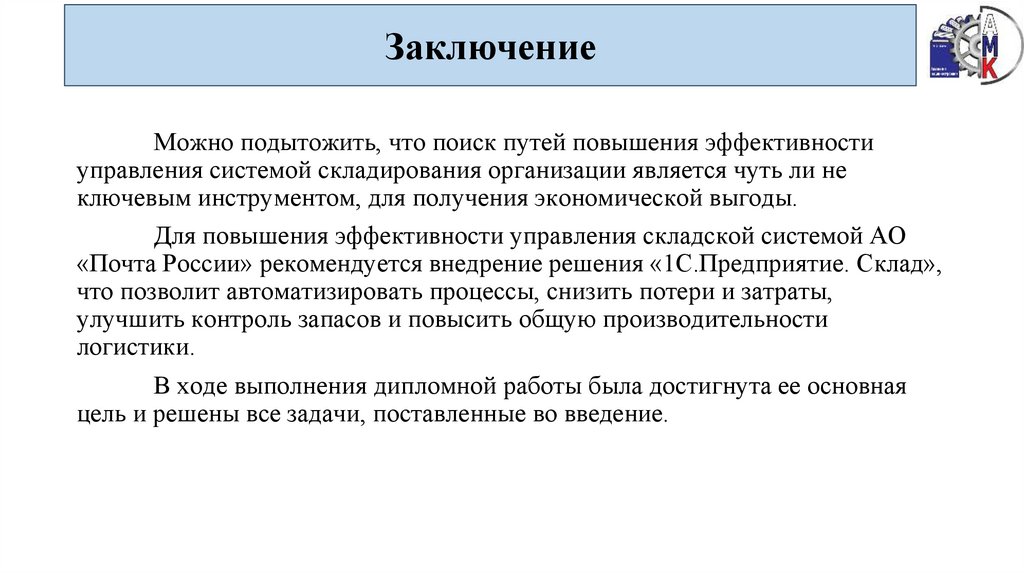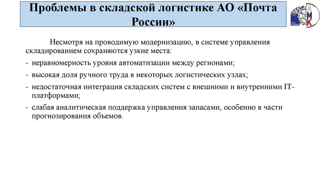 Повышение эффективности управления системой складирования предприятия АО «Почта России»