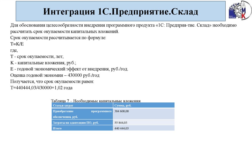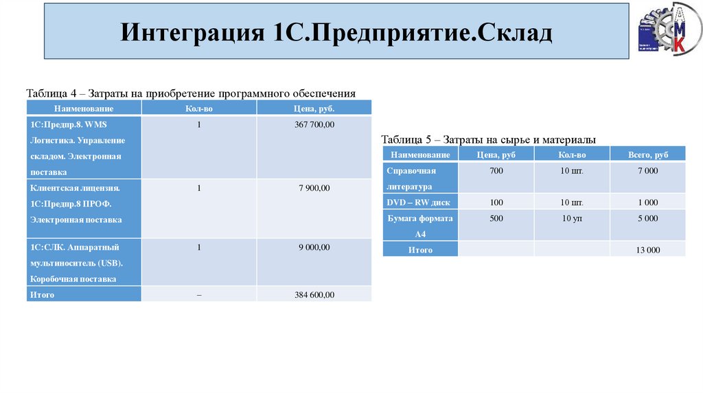 Интеграция 1С.Предприятие.СкладТаблица 4 – Затраты на приобретение программного обеспечения