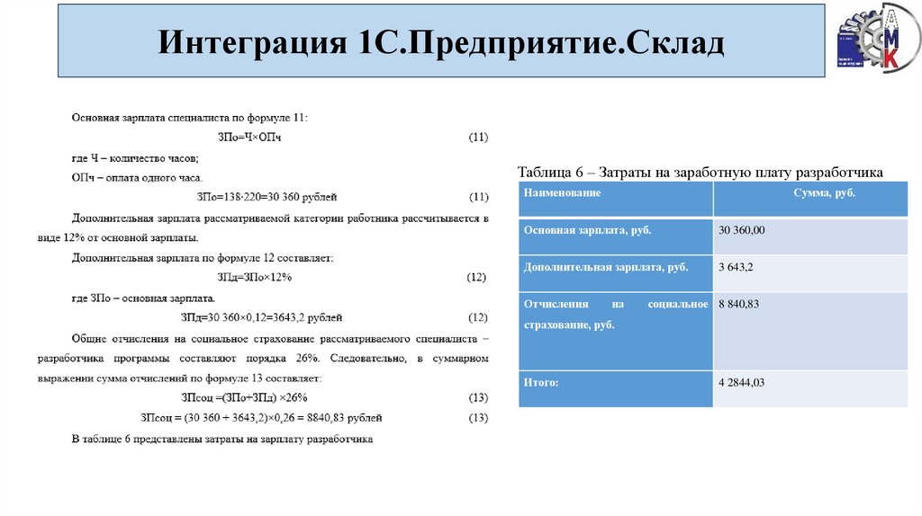 Интеграция 1С.Предприятие.СкладТаблица 6 – Затраты на заработную плату разработчика