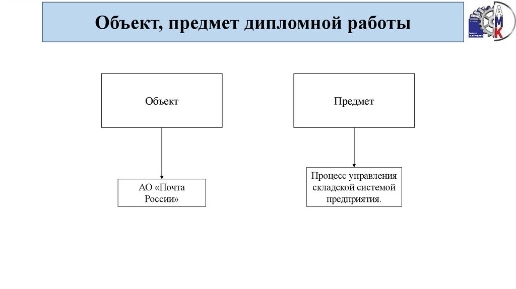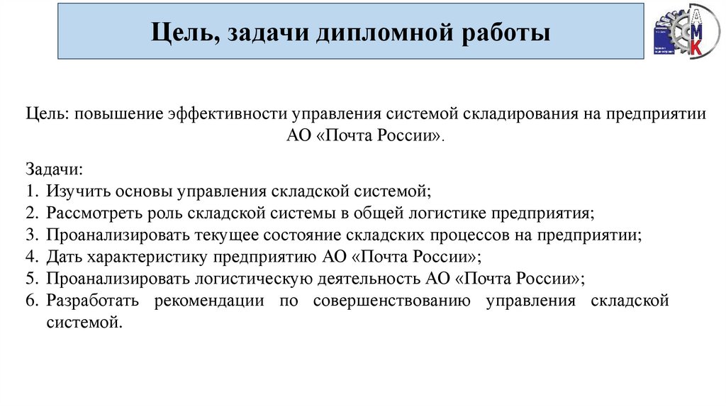 Цель, задачи дипломной работыЦель: повышение эффективности управления системой складирования на предприятии