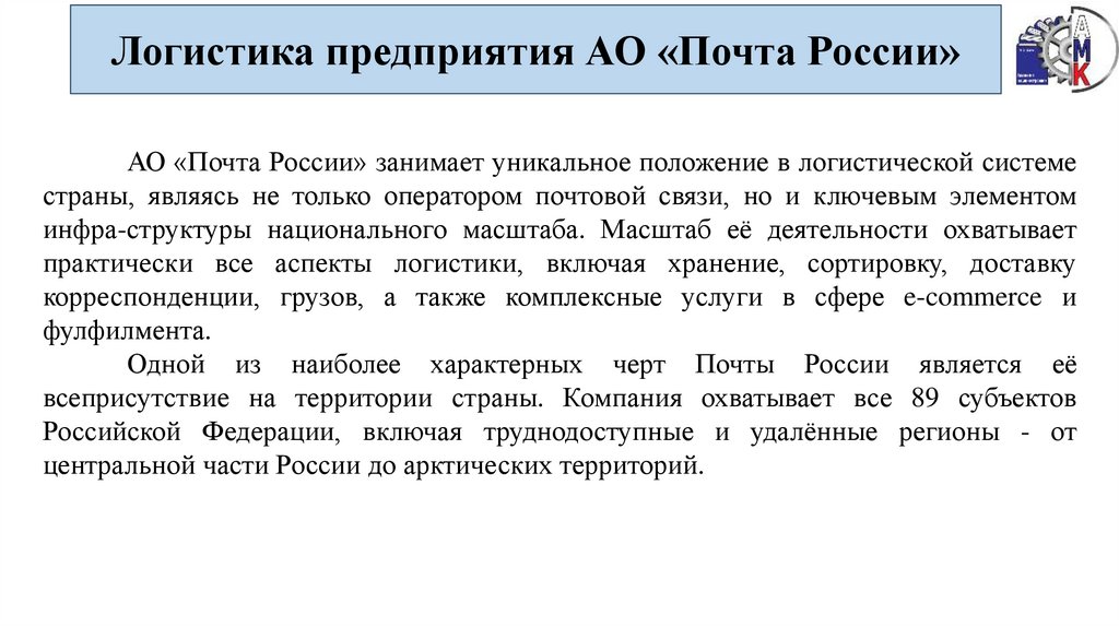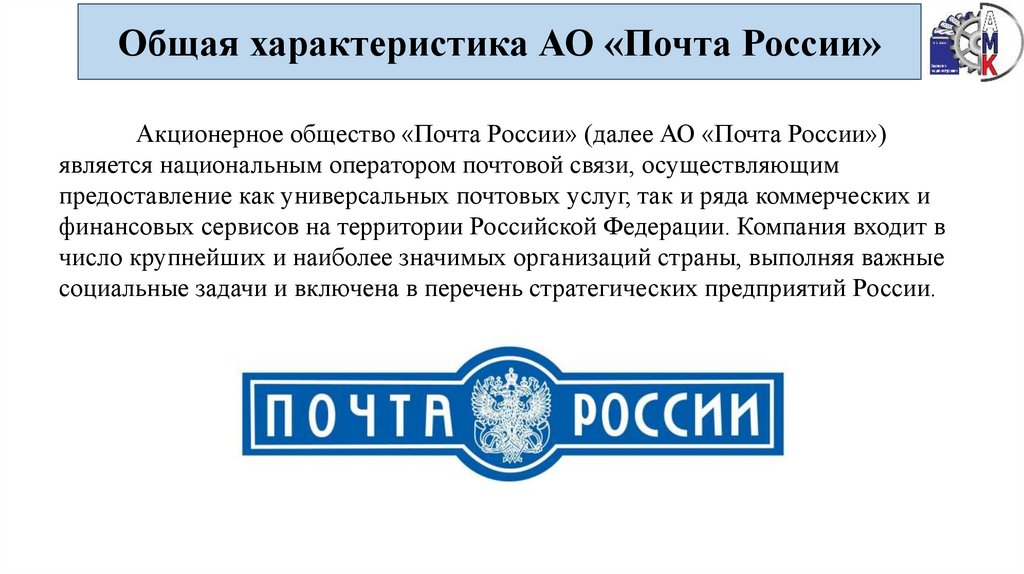 Общая характеристика АО «Почта России»Акционерное общество «Почта России» (далее АО «Почта России»)