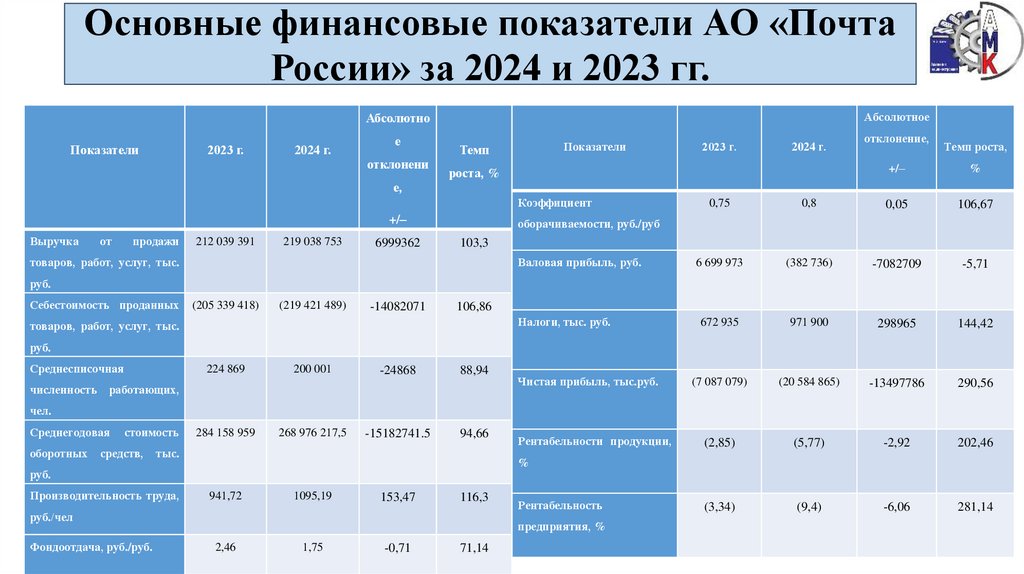 Основные финансовые показатели АО «ПочтаРоссии» за 2024 и 2023 гг.