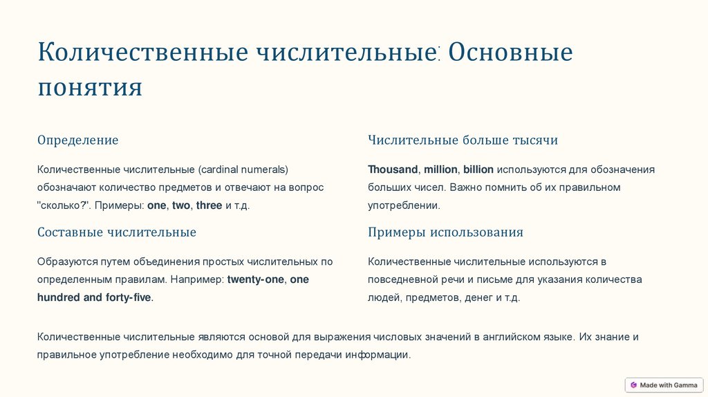 Количественные числительные являются основой для выражения числовых значений в английском языке. Их знание и