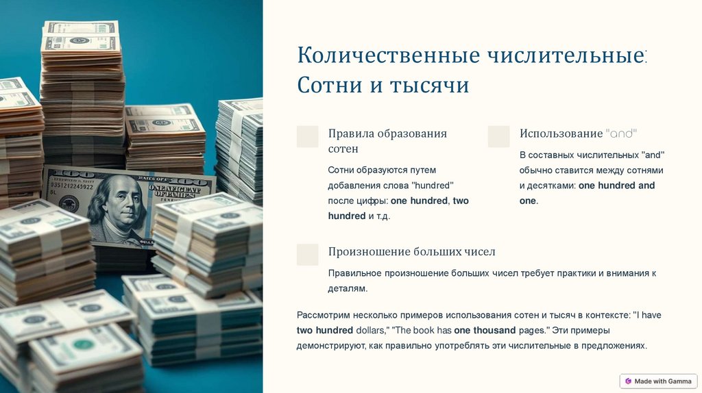 two hundred dollars," "The book has one thousand pages." Эти примеры