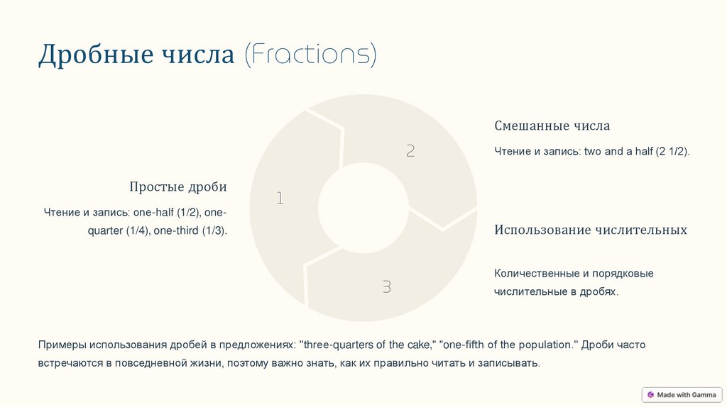 Примеры использования дробей в предложениях: "three-quarters of the cake," "one-fifth of the population." Дроби часто