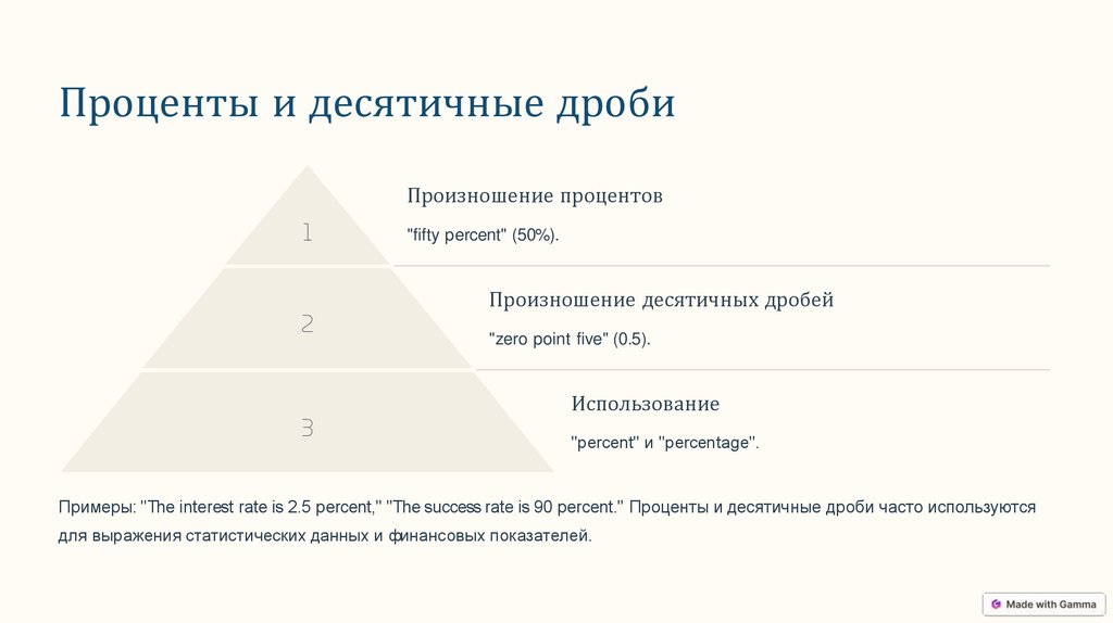 Примеры: "The interest rate is 2.5 percent," "The success rate is 90 percent." Проценты и десятичные дроби часто используются