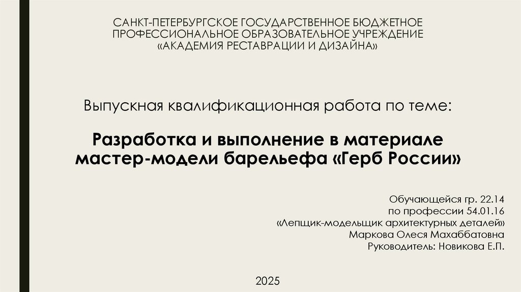 Разработка и выполнение в материале мастер-модели барельефа «Герб России»