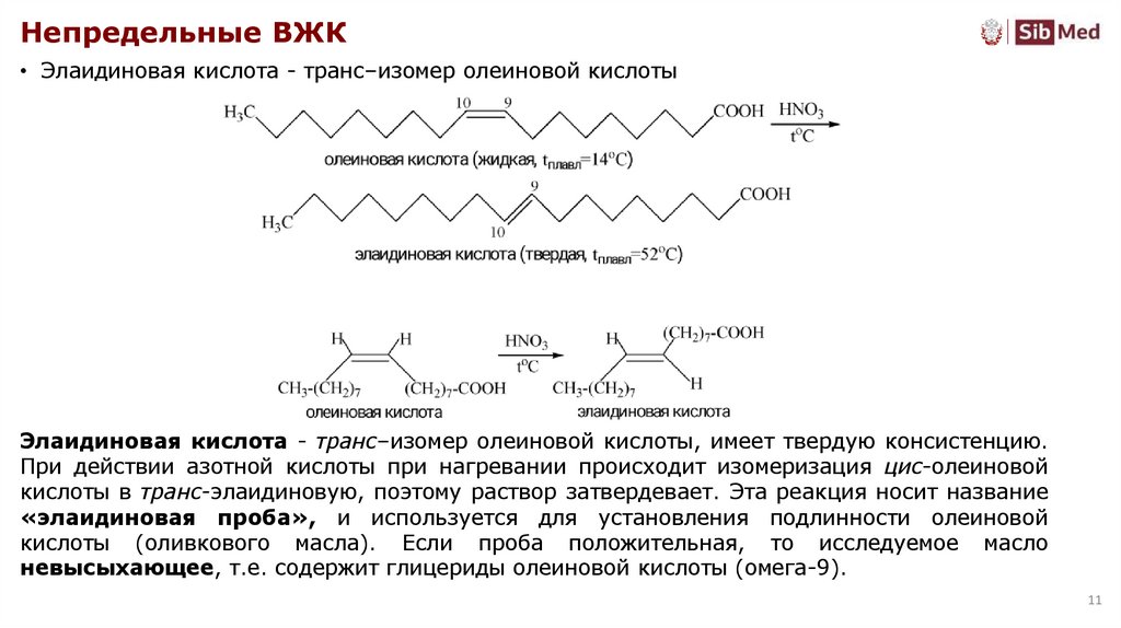 кислоты в транс-элаидиновую, поэтому раствор затвердевает. Эта реакция носит название