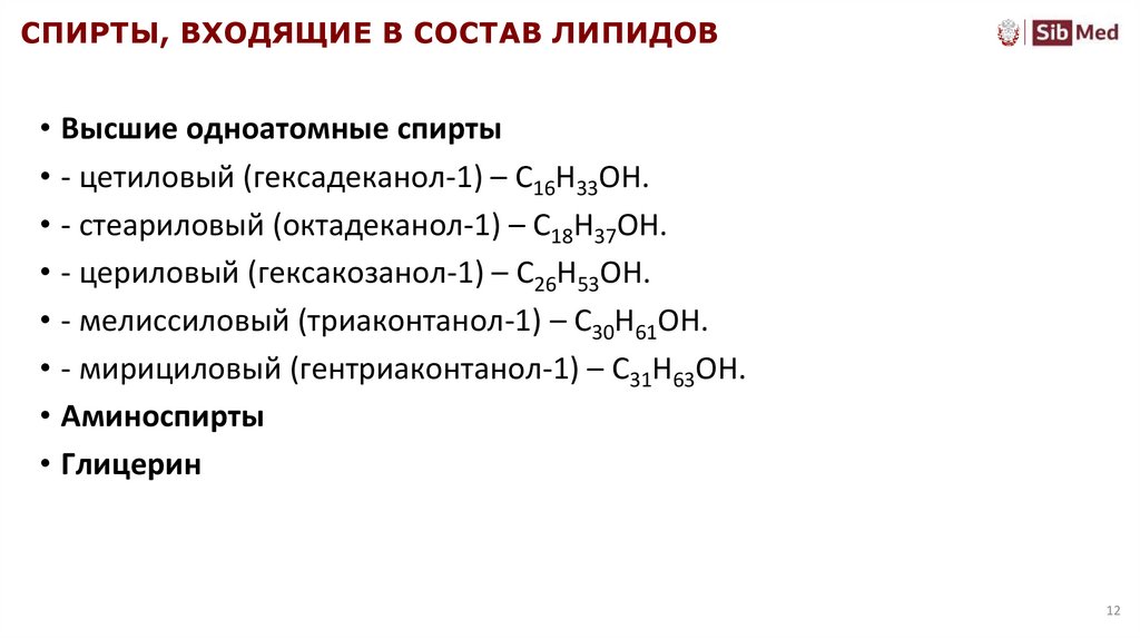 СПИРТЫ, ВХОДЯЩИЕ В СОСТАВ ЛИПИДОВ• Высшие одноатомные спирты