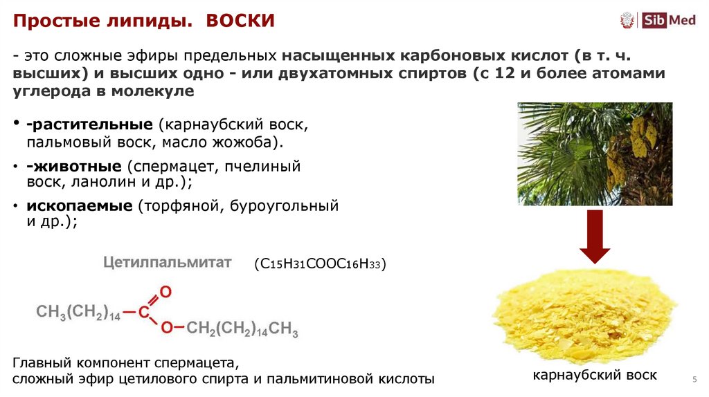 Простые липиды. ВОСКИ- это сложные эфиры предельных насыщенных карбоновых кислот (в т. ч.