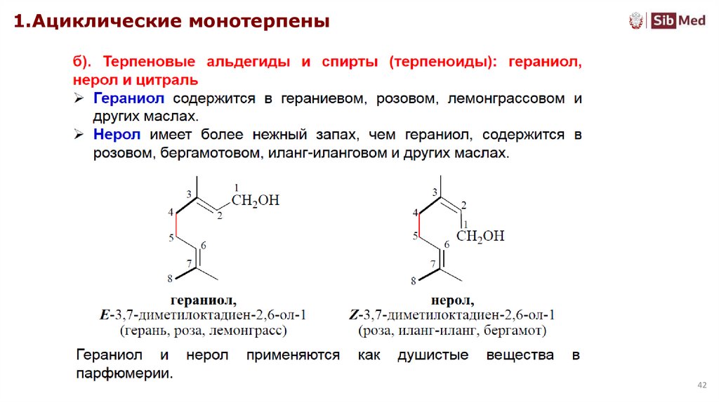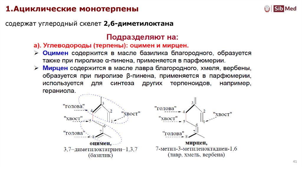 1.Ациклические монотерпенысодержат углеродный скелет 2,6-диметилоктана