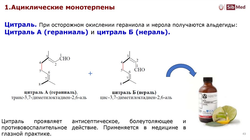 1.Ациклические монотерпеныЦитраль. При осторожном окислении гераниола и нерола получаются альдегиды: