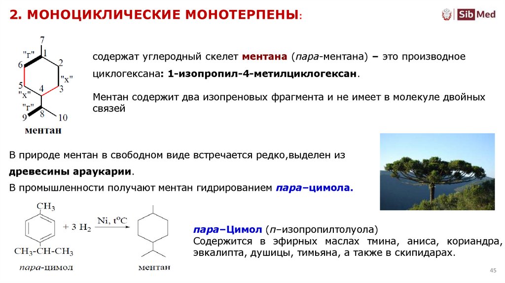 2. МОНОЦИКЛИЧЕСКИЕ МОНОТЕРПЕНЫ:содержат углеродный скелет ментана (пара-ментана) – это производное
