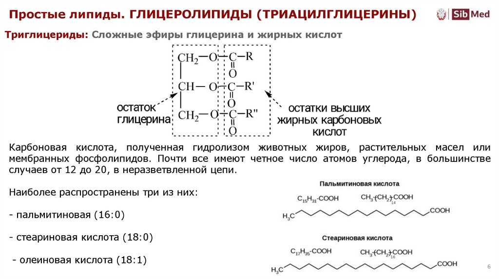 Простые липиды. ГЛИЦЕРОЛИПИДЫ (ТРИАЦИЛГЛИЦЕРИНЫ)Триглицериды: Сложные эфиры глицерина и жирных кислот