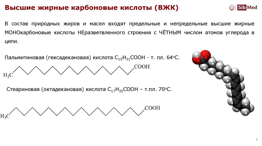 Высшие жирные карбоновые кислоты (ВЖК)В состав природных жиров и масел входят предельные и непредельные высшие жирные