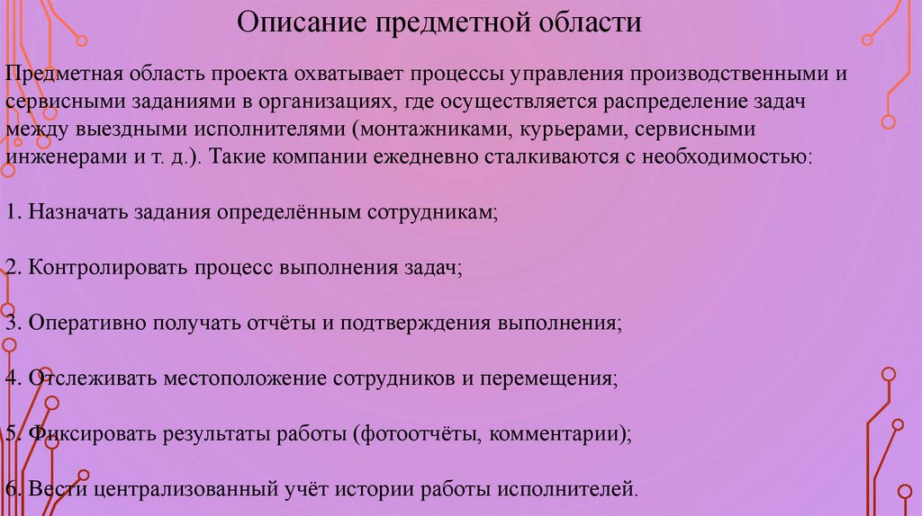 Описание предметной областиПредметная область проекта охватывает процессы управления производственными и