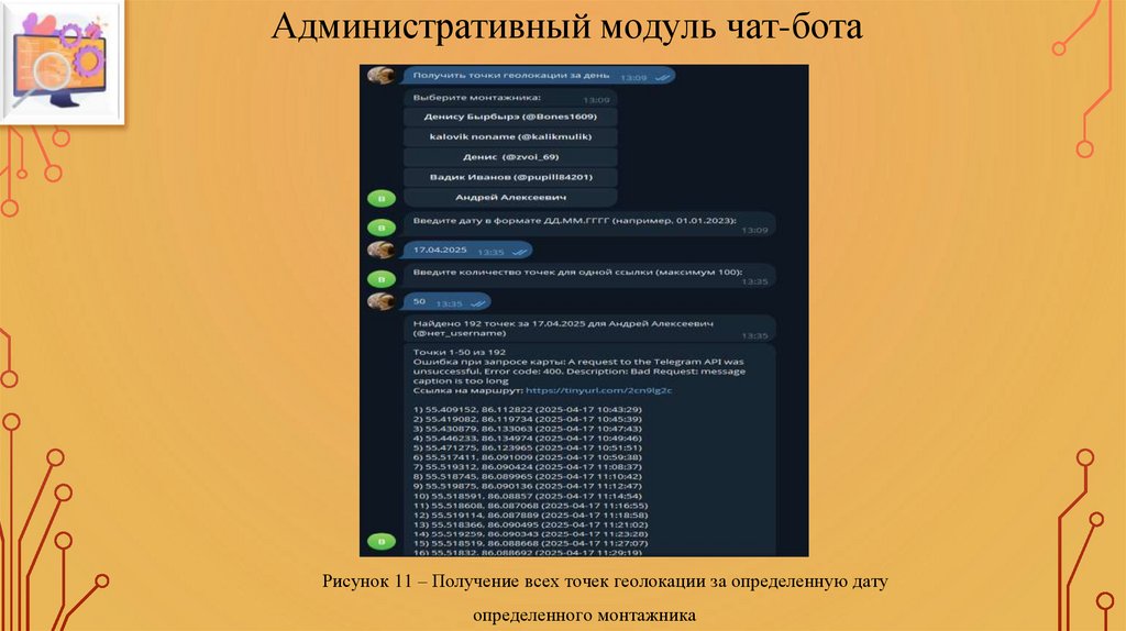 Административный модуль чат-ботаРисунок 11 – Получение всех точек геолокации за определенную дату