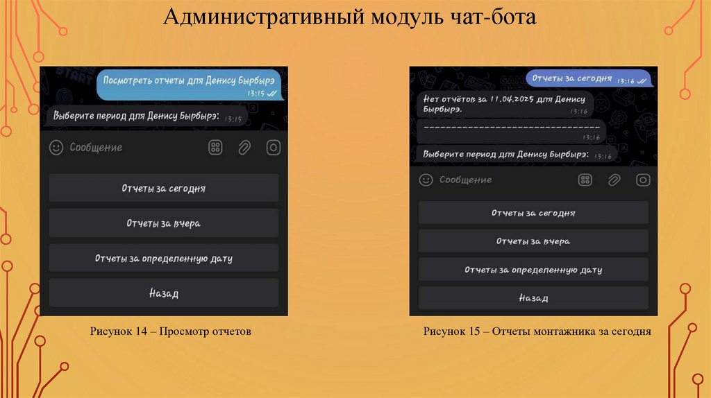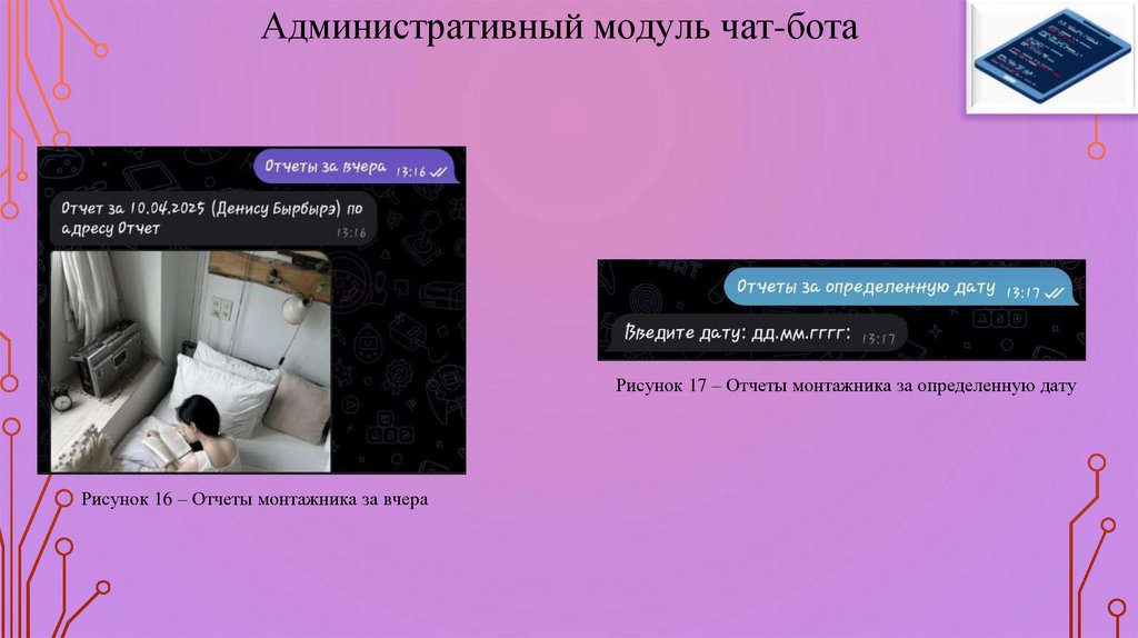 Административный модуль чат-ботаРисунок 17 – Отчеты монтажника за определенную дату