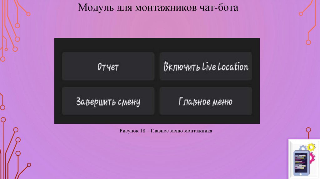 Модуль для монтажников чат-ботаРисунок 18 – Главное меню монтажника