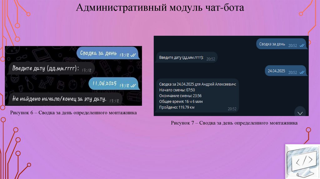 Административный модуль чат-ботаРисунок 6 – Сводка за день определенного монтажника