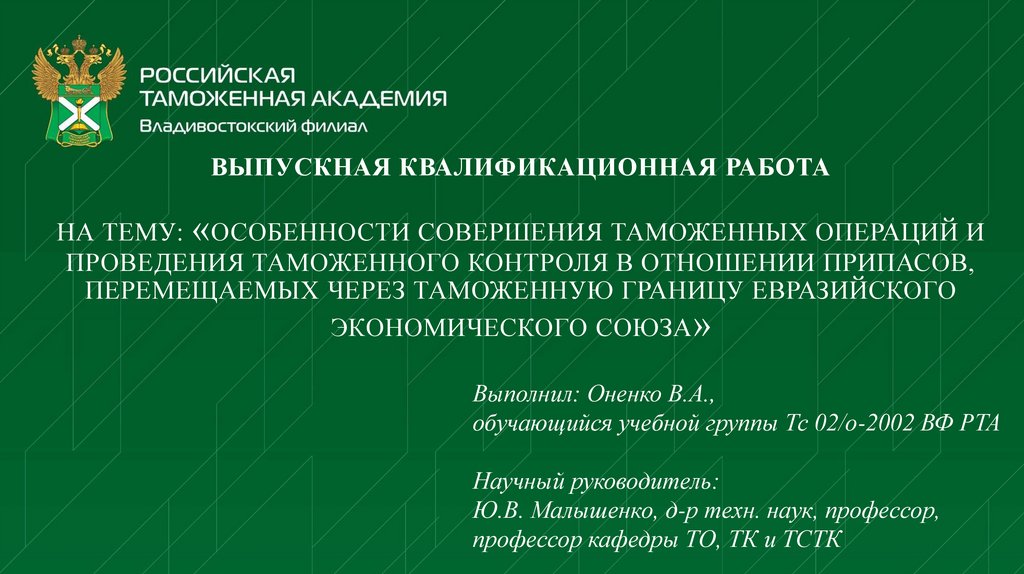 ВЫПУСКНАЯ КВАЛИФИКАЦИОННАЯ РАБОТАНА ТЕМУ: «ОСОБЕННОСТИ СОВЕРШЕНИЯ ТАМОЖЕННЫХ ОПЕРАЦИЙ И