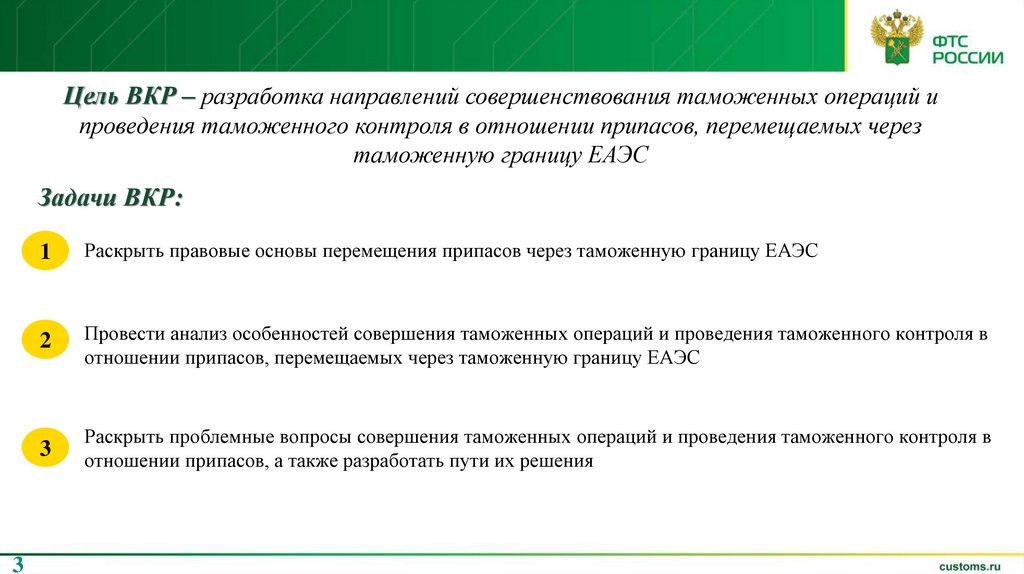 Цель ВКР – разработка направлений совершенствования таможенных операций ипроведения таможенного контроля в отношении припасов, перемещаемых через