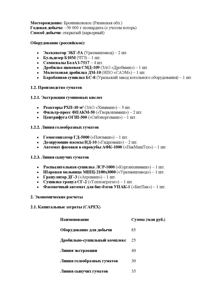 Месторождение: Бронниковское (Рязанская обл.)Годовая добыча: ~50 000 т леонардита (с учетом потерь)