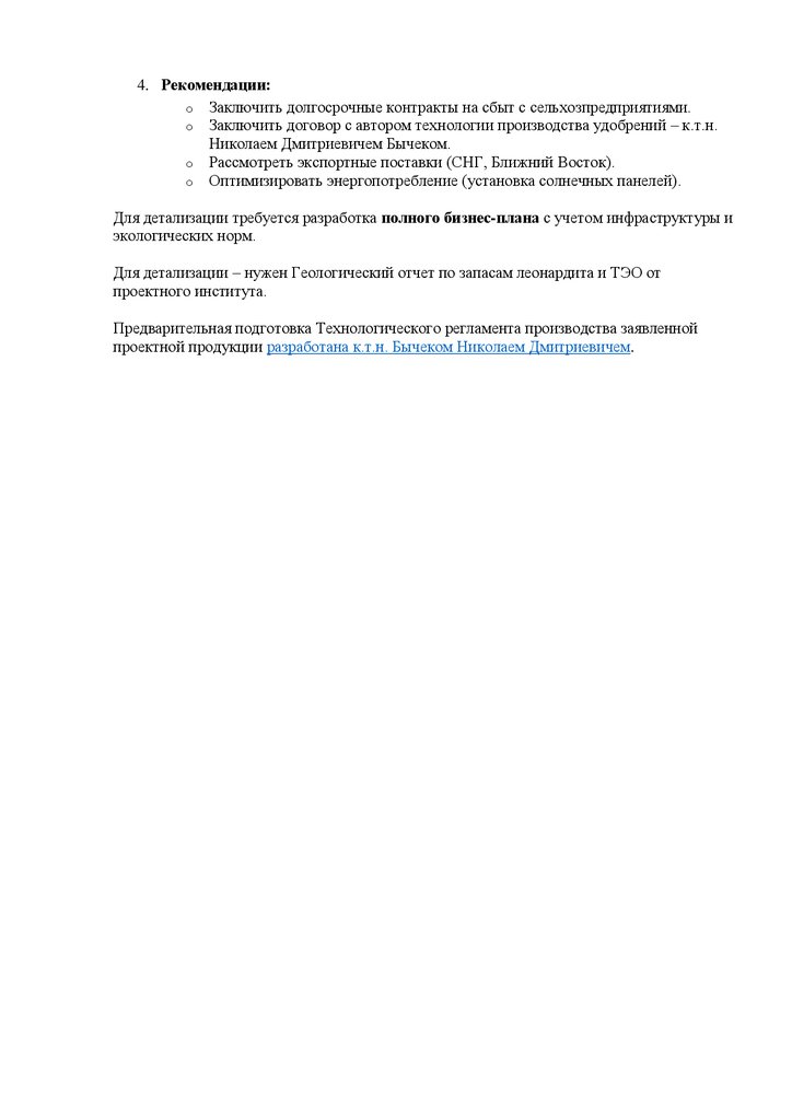 o Заключить договор с автором технологии производства удобрений – к.т.н.