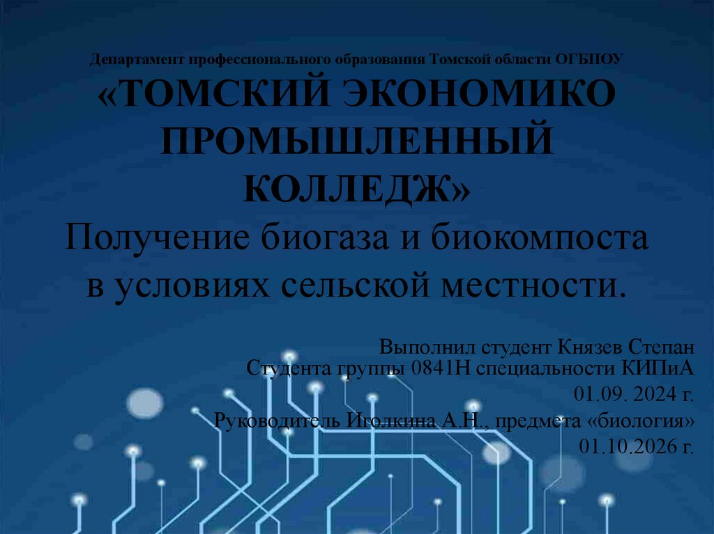 1. Департамент профессионального образования Томской области ОГБПОУ «ТОМСКИЙ ЭКОНОМИКО ПРОМЫШЛЕННЫЙ КОЛЛЕДЖ» Получение биогаза и